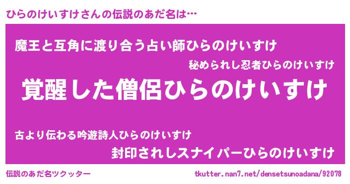 | 意味不明あだ名 | 『住所不定無職ひらのけいすけ(68歳)』 |