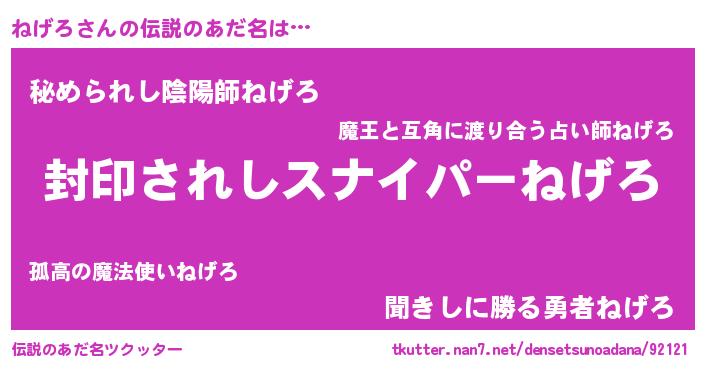 | 男性向けラノベタイトル風あだ名 | 『ねげろに滅ぼされるだけの簡単なお仕事です』 |