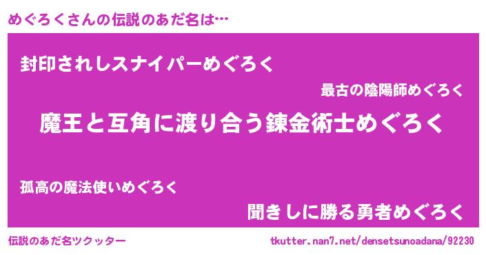 | ヘコむあだ名 | 『めぐっふぃ~』『めぐろく(遠い目)』 |