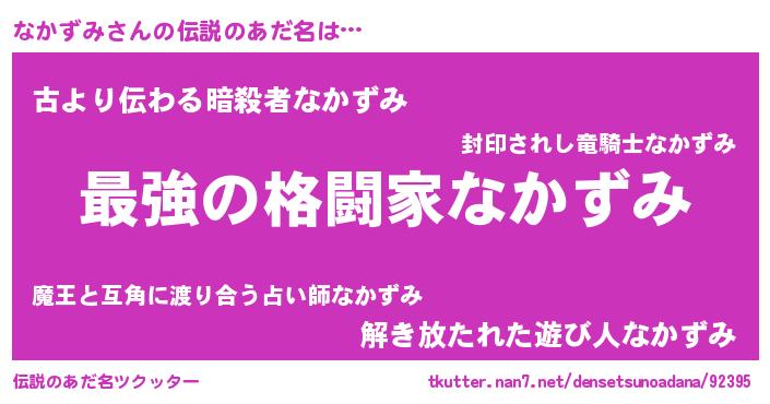 | ファンタジー風あだ名 | 『エターナルナカズミー』『ゼナカトゥ』 |