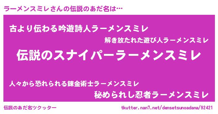 | 胡散臭い通販商品みたいなあだ名 | 『必ず成功する霊験あらたかなお札…その名も「ラーメンスミレ」』 |