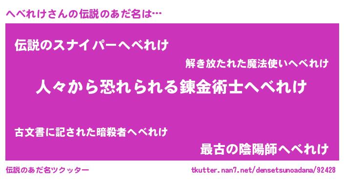 | 男性向けラノベタイトル風あだ名 | 『おまえをオタクにしてやるから、俺をへべれけにしてくれ! 』 |