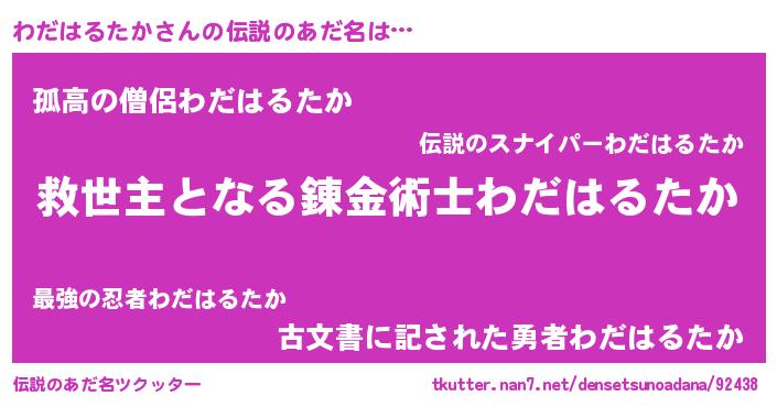 | 男性向けラノベタイトル風あだ名 | 『ノーゲーム・ノーワダハルタカ』 |