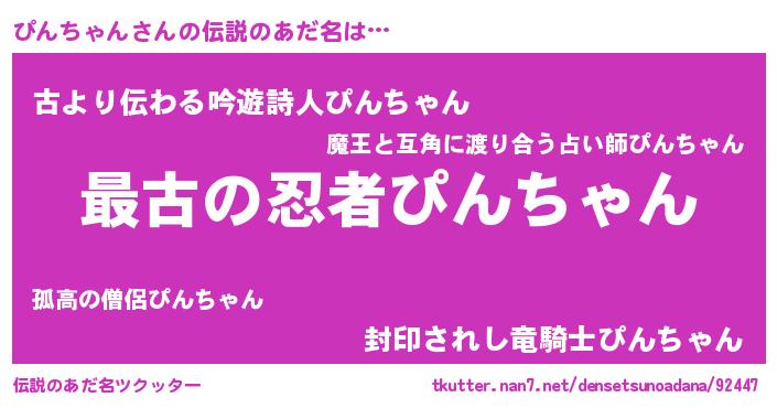 | 男性向けラノベタイトル風あだ名 | 『この素晴らしい世界にぴんちゃんを!』 |