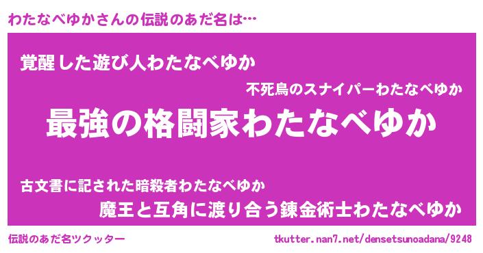 | 男性向けラノベタイトル風あだ名 | 『この素晴らしい世界にわたなべゆかを!』 |