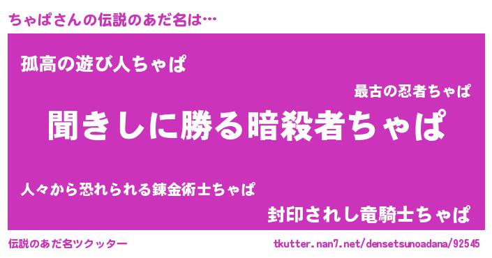 | 男性向けラノベタイトル風あだ名 | 『ちゃぱという概念が存在しない退屈な世界 』 |