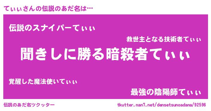 | 女子向けラノベタイトル風あだ名 | 『異世界で失敗しない100のてぃぃ』 |