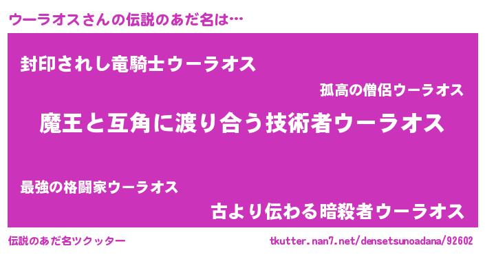 | ヒーロー風カッコイイあだ名 | 『慈愛の使者ウーラオス』『仮面ウーダー』 |