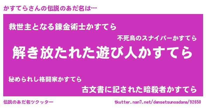 | ヒーロー風カッコイイあだ名 | 『魔戒騎士カス』『天空の使者かすてら』 |