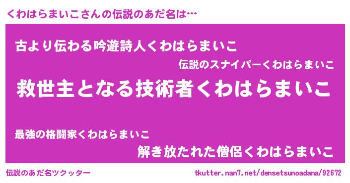 | 男性向けラノベタイトル風あだ名 | 『くわはらまいこ~年齢イコール彼女いない歴の魔法使い~』 |