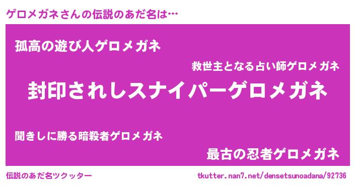 | ヒーロー風カッコイイあだ名 | 『スーパーゲロメガネ』『黄金騎士ゲロ』 |