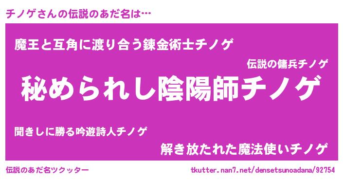 | 女子向けラノベタイトル風あだ名 | 『チノゲの雑貨屋さん』『チノゲ恋絵巻』 |