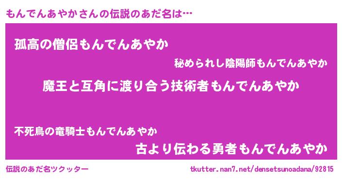 | 女子向けラノベタイトル風あだ名 | 『もんでんあやか恋絵巻』 |