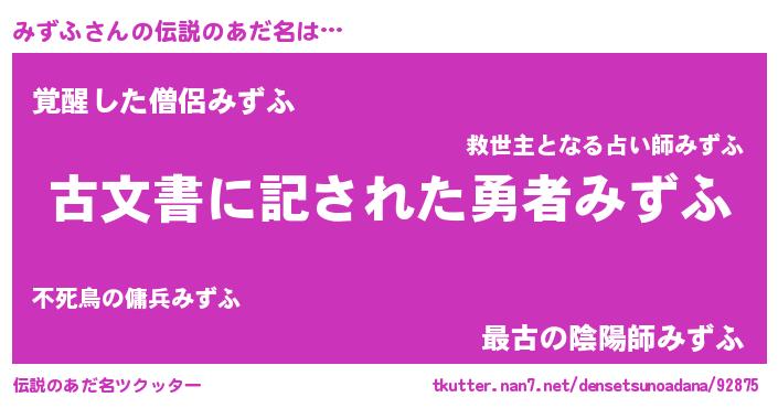 | ヒーロー風カッコイイあだ名 | 『ネオミズフ』『究極戦士ミズフ』 |
