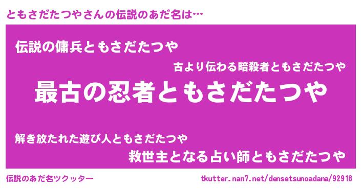 | 男性向けラノベタイトル風あだ名 | 『魔弾の王とともさだたつや』 |