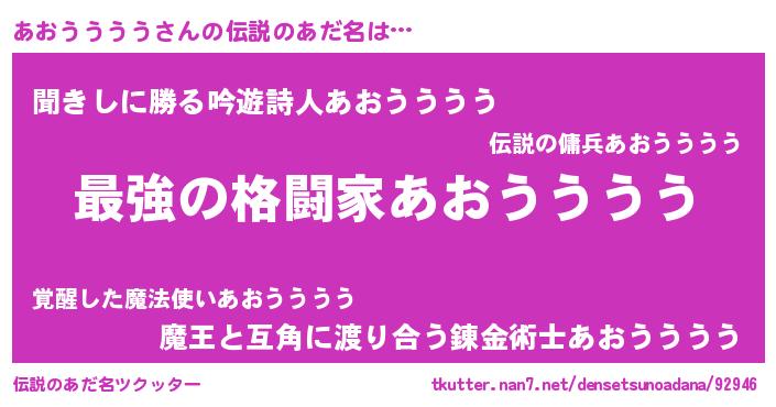 | 男性向けラノベタイトル風あだ名 | 『うちの娘の為ならば、俺はもしかしたらあおううううも倒せるかもしれない。』 |