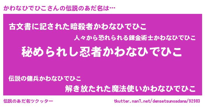 | 男性向けラノベタイトル風あだ名 | 『カワナヒデヒコスレイヤー』 |