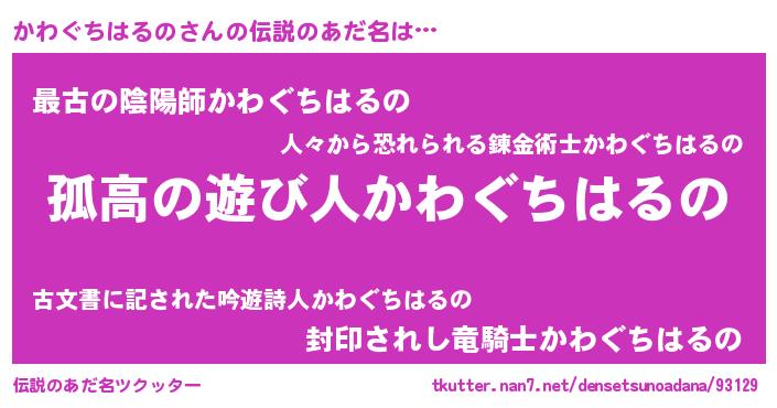 | 男性向けラノベタイトル風あだ名 | 『ダンジョンにかわぐちはるのを求めるのは間違っているだろうか』 |