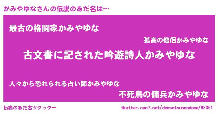 | 意味不明あだ名 | 『永久保存かみやゆな』『自称かみやゆな』 |