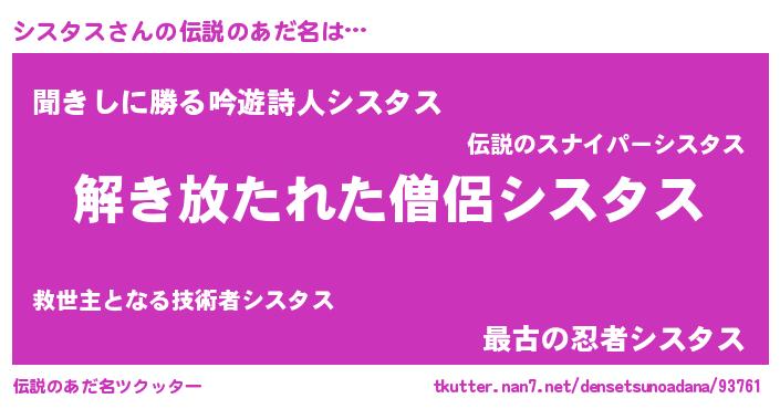 | 男性向けラノベタイトル風あだ名 | 『シスタスの嫁は女の子じゃないと思った?』 |