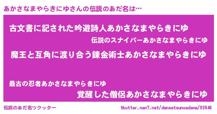 | ヘコむあだ名 | 『あかさなまやらきにゆ(遠い目)』『あかを』 |