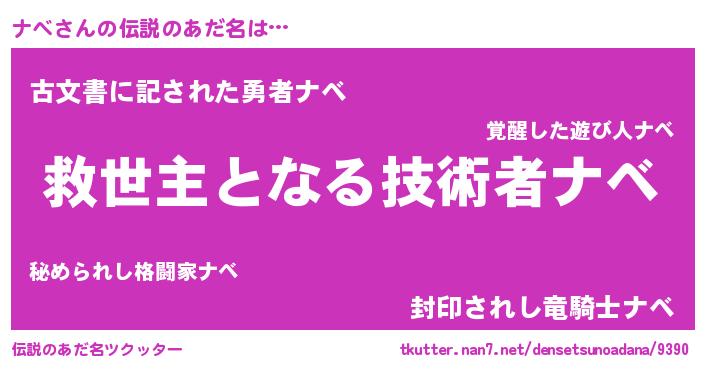 | ヒーロー風カッコイイあだ名 | 『慈愛の使者ナベ』『ネオナベ』 |