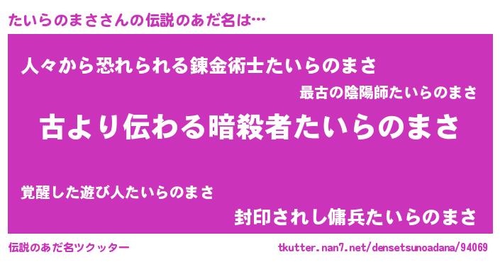 | 意味不明あだ名 | 『住所不定無職たいらのまさ(62歳)』 |