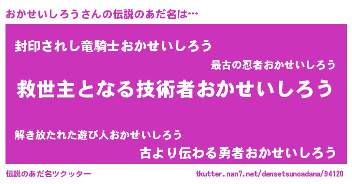 | 意味不明あだ名 | 『住所不定無職おかせいしろう(7歳)』 |