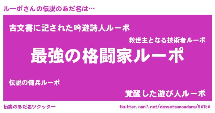 | ポケモン風あだ名 | 『ルーポダネ』『ゼニルー』 |
