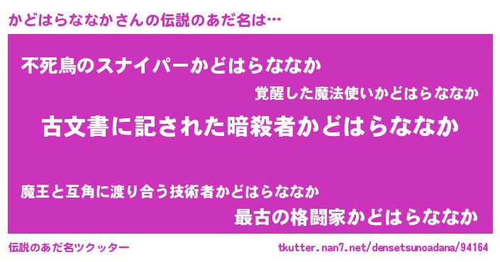 | ヒーロー風カッコイイあだ名 | 『ネオカドハラナナカ』『天弓騎士カド』 |