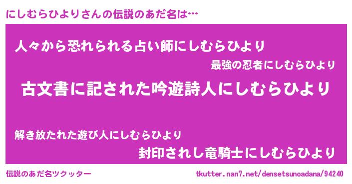 | ヒーロー風カッコイイあだ名 | 『ネオニシムラヒヨリ』『仮面ニシダー』 |