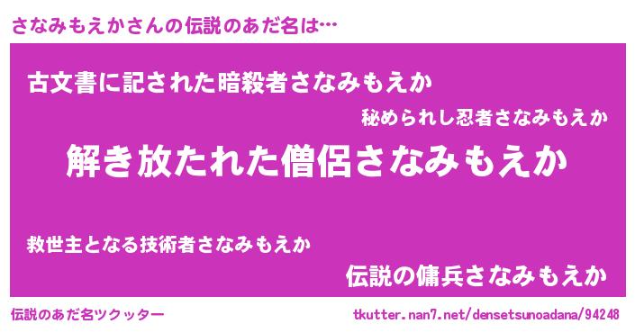 | 男性向けラノベタイトル風あだ名 | 『転生したらさなみもえかだった件』 |