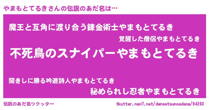 | 男性向けラノベタイトル風あだ名 | 『魔弾の王とやまもとてるき』 |