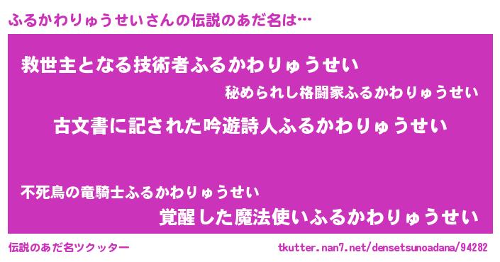 | 男性向けラノベタイトル風あだ名 | 『この素晴らしい世界にふるかわりゅうせいを!』 |