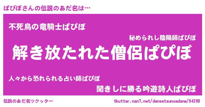| 女子向けラノベタイトル風あだ名 | 『ぱぴぼの卵を拾いまして』 |