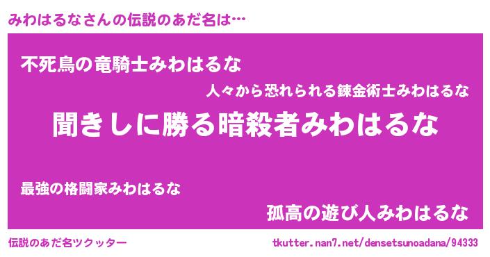| 男性向けラノベタイトル風あだ名 | 『みわはるなという概念が存在しない退屈な世界 』 |