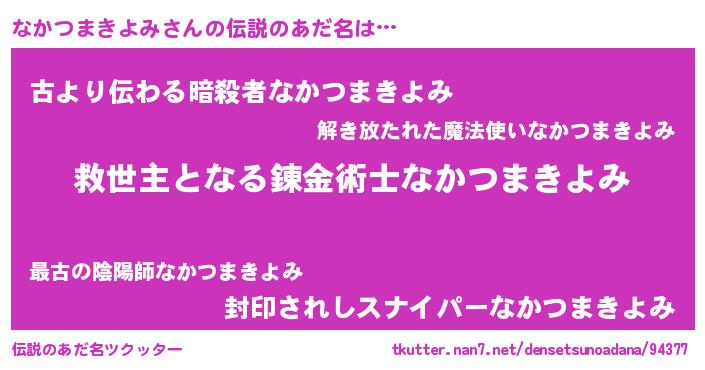 | 男性向けラノベタイトル風あだ名 | 『なかつまきよみ~年齢イコール彼女いない歴の魔法使い~』 |