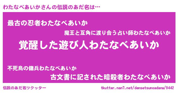 | 女子向けラノベタイトル風あだ名 | 『悪役わたなべあいかに転生したようですが、知った事ではありません』 |