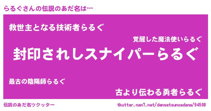| 意味不明あだ名 | 『住所不定無職らるぐ(93歳)』『自称らるぐ』 |