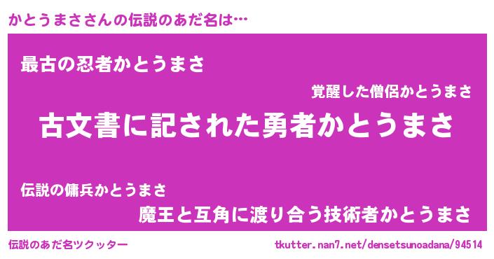 | ヒーロー風カッコイイあだ名 | 『ネオカトウマサ』『愛の使者かとうまさ』 |
