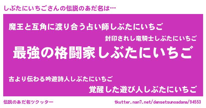 | 男性向けラノベタイトル風あだ名 | 『うちのしぶたにいちごが世界を掌握している!』 |