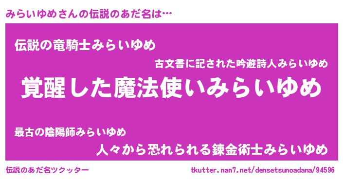 | 男性向けラノベタイトル風あだ名 | 『みらいゆめの嫁は女の子じゃないと思った?』 |