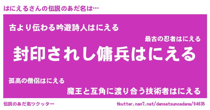 | 意味不明あだ名 | 『つくし科はにえる属』『自称はにえる』 |