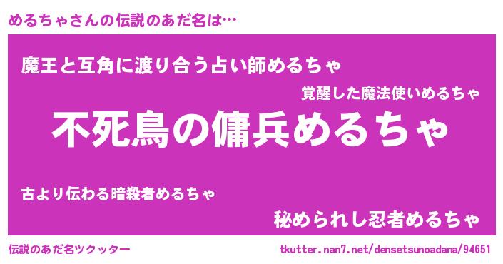 | 男性向けラノベタイトル風あだ名 | 『魔弾の王とめるちゃ』『めるちゃの憂鬱』 |