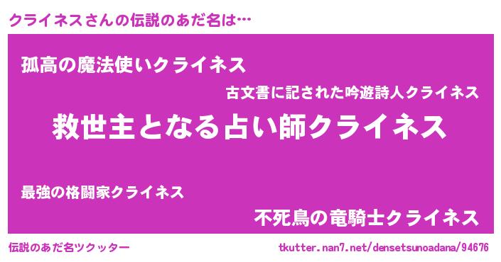 | 男性向けラノベタイトル風あだ名 | 『クライネス~年齢イコール彼女いない歴の魔法使い~』 |