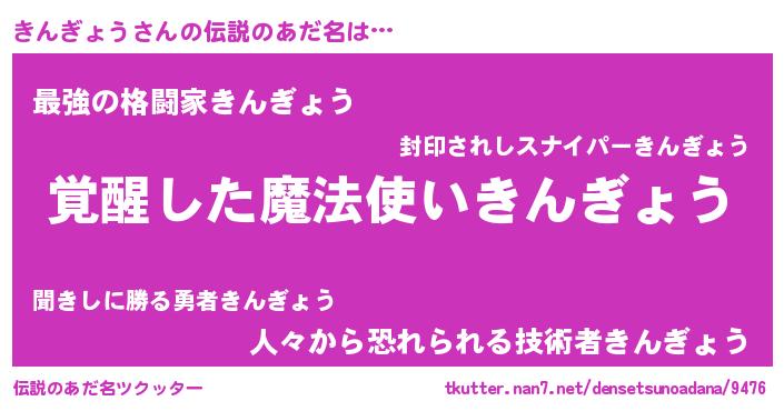 | ヒーロー風カッコイイあだ名 | 『天弓騎士キン』『正義の使者きんぎょう』 |