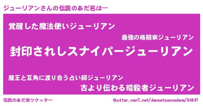 | ヒーロー風カッコイイあだ名 | 『最強戦士ジューリアン』『幻影騎士ジュ』 |