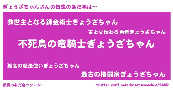 | 女子向けラノベタイトル風あだ名 | 『ぎょうざちゃん姫と円卓の騎士』 |
