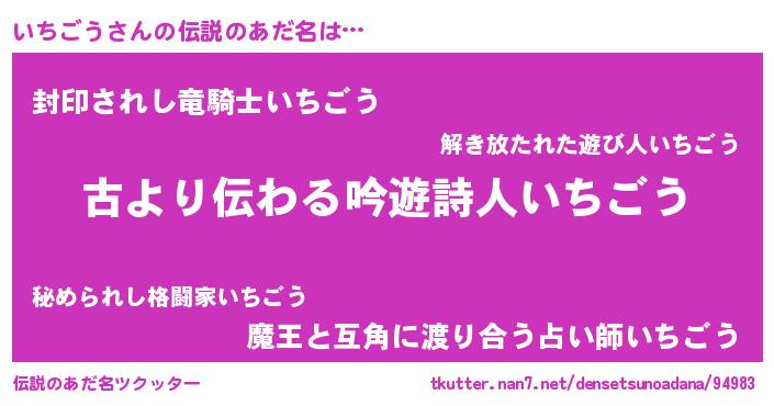 | 男性向けラノベタイトル風あだ名 | 『転生したらいちごうだった件』 |
