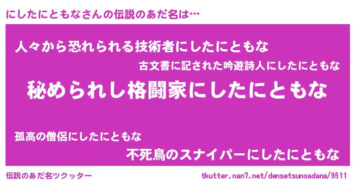 | 男性向けラノベタイトル風あだ名 | 『緋弾のニシタニトモナ』 |